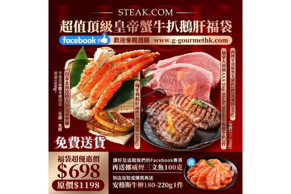 頂級皇帝蟹, 牛扒, 黑毛豬扒, 鵝肝福袋, 超特價發售, 平時出去買一隻皇帝蟹都要$1400以上, 而家半隻日本皇帝蟹再連埋牛扒黑毛豬鵝肝, 都只係需要$698,真心超平